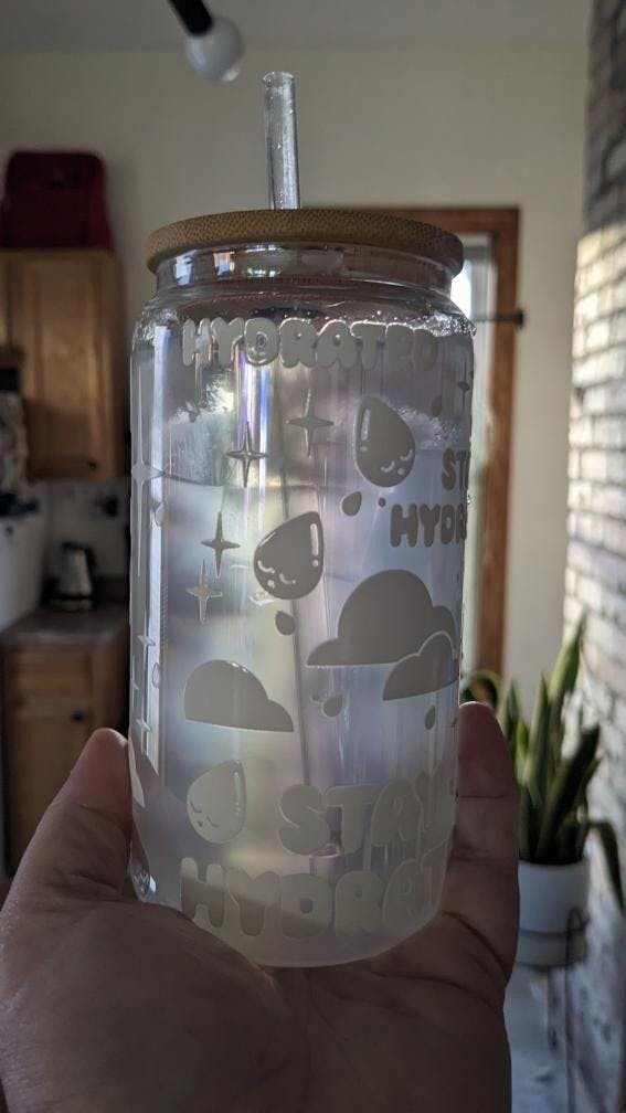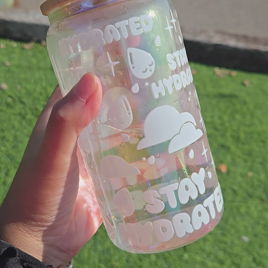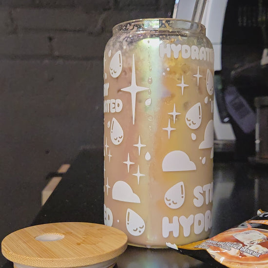 Glass tumbler with silk screen "Stay Hydrated" graphics featuring cute, sleepy little water droplets.
